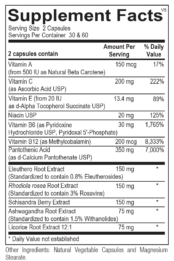 Adapten-All includes a blend of key micronutrients and adaptogenic botanicals specifically formulated to strengthen the body’s stress response and support healthy energy levels. Adapten-All provides targeted amounts of vitamin C, pantothenic acid and other B vitamins that are critical to adrenal gland function. Adapten-All also provides a unique blend of “stress adapting botanicals” which help increase the body’s resistance to fatigue and maintain balanced cortisol and DHEA levels.