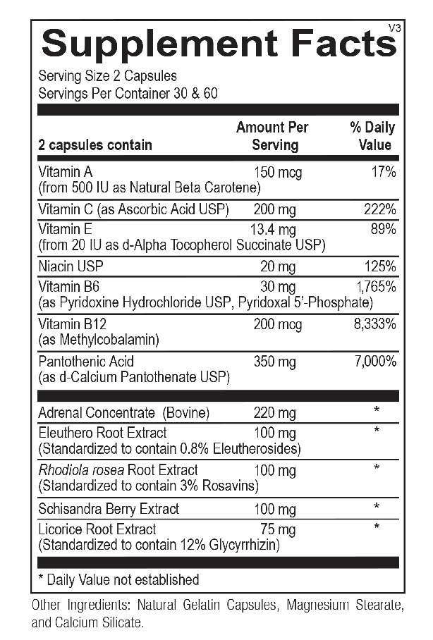 Adren-All contains a blend of key micronutrients, adaptogenic botanicals and adrenal concentrate specifically formulated to strengthen the body’s stress response and support healthy energy levels. Adren-All provides targeted amounts of vitamin A and C, pantothenic acid, and other B vitamins that are critical to adrenal gland function. This powerful formulation helps support the body’s resistance to fatigue and aids in maintaining balanced cortisol and DHEA levels.